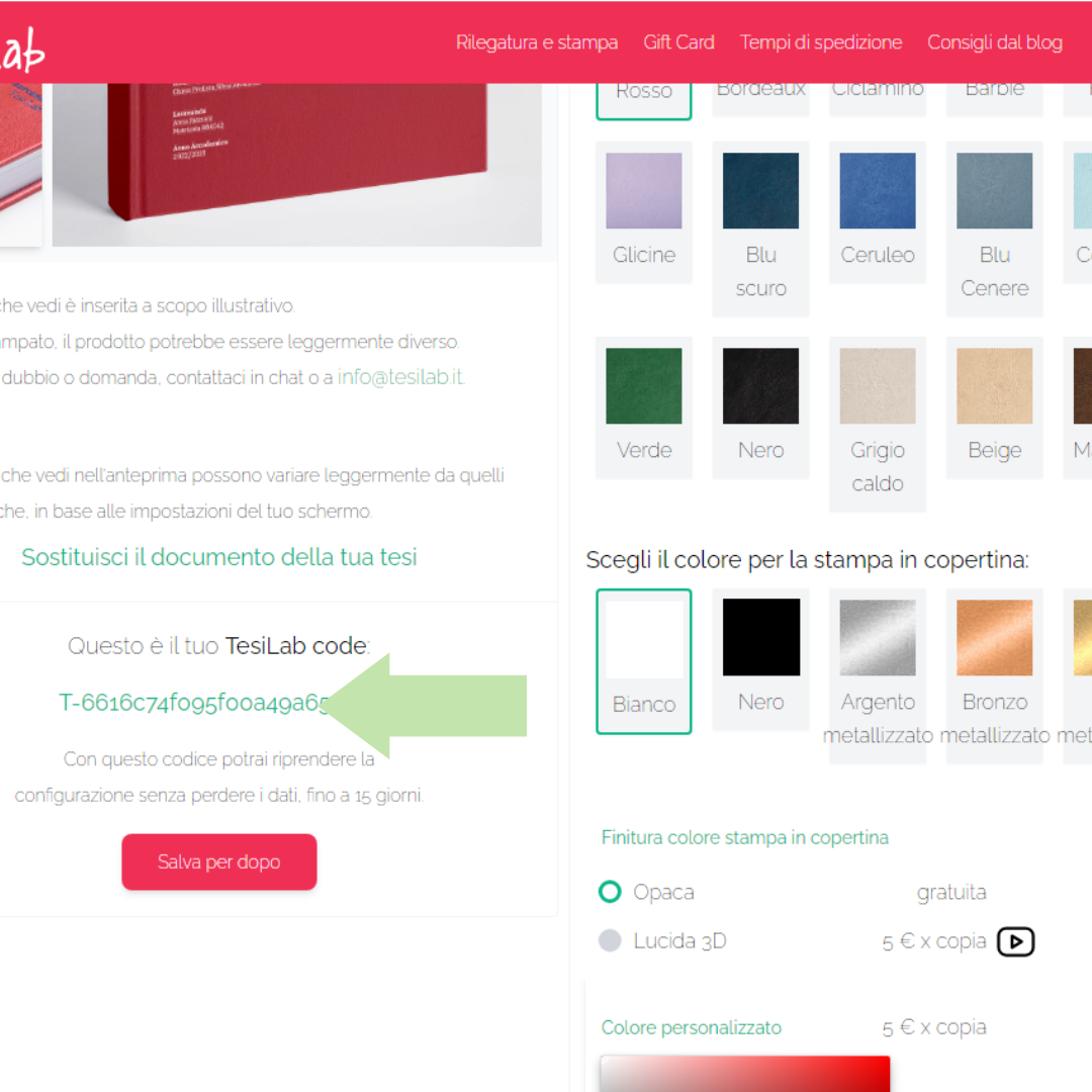 Quando ci contatti via mail o in chat sul sito, per domande molto specifiche sulla configurazione, ti chiederemo di indicarci il TesiLab code così da poter visualizzare la configurazione che hai iniziato e saperti rispondere in modo preciso.